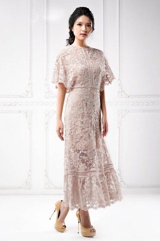 - Delicate lace maxi dress with asymmetric hem and shirred back seam